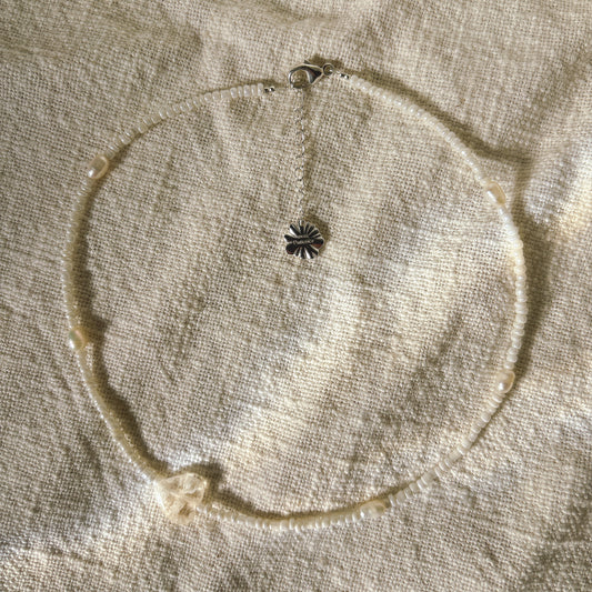 Women necklace with yellow mother-of-pearl flowers, semi-precious quartz beads, and delicate pink glass beads